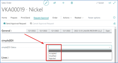 After importing the orders, you can use a standard-approval workflow for requesting and releasing the document. If you don’t have activated an approval workflow, the document is automatically released after changing the simple|EDI status field: