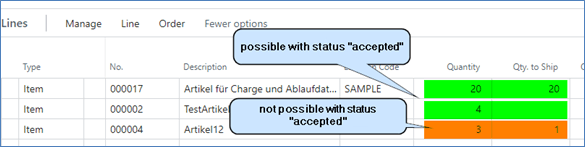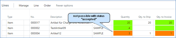 • Accepted: If you don’t have any changes e.g. adding items, changing the quantity or delivery date, you can mark this order as accepted. Each line (or all lines) of the sales order you want to ship and invoice at a whole.