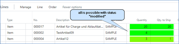 The sales order has the simple|EDI status “modified”: it is possible to post the shipment fully or partly:
